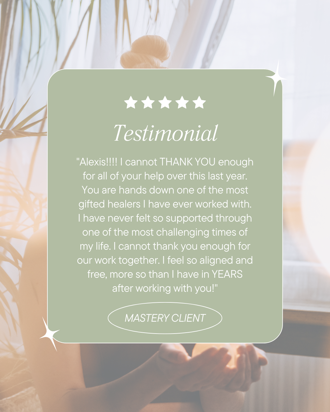 Inside this high-touch container, you’ll experience a custom blend of clinical hypnotherapy, NLP, EFT, somatic coaching, life & success coaching, intuitive guidance, and energy work...woven together in a way that meets you exactly where you are, and moves you to where you’re meant to be.